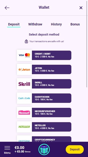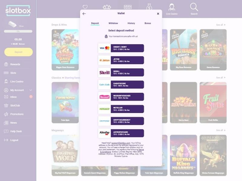 Slotbox の銀行オプションには、ビットコイン決済オプションのほか、決済カードや多くの一般的な電子ウォレットなど、他のすべての標準的なオンライン カジノ決済方法が含まれます。