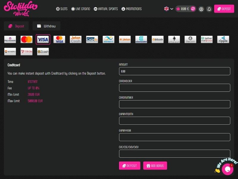 安全な金融取引は、オンラインカジノの評判を物語ります。Slotilda Worldは、暗号通貨を含む世界的に有名な決済オプションを提供しているため、プレイヤーは最も信頼性の高い銀行サービスと満足のいく出金時間を期待できます。