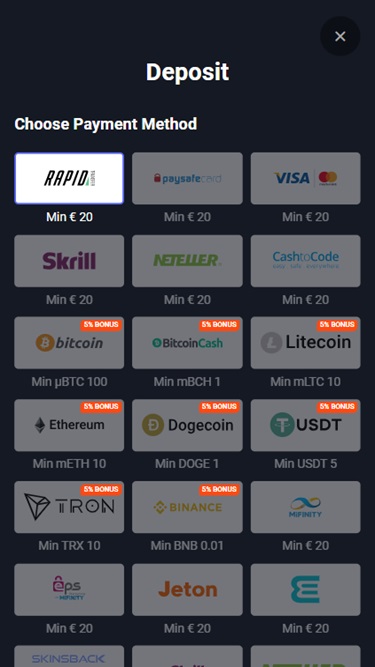 このオペレーターは複数の決済方法を提供しています。従来の決済方法としては、 Visa 、 Mastercard 、銀行振込、 Neteller 、 Neosurf 、 MuchBetter 、 MiFinity 、 Paysafecardなどが挙げられます。一方、最新の決済方法としては、ビットコイン、ビットコインキャッシュ、ドージコイン、イーサリアム、ライトコイン、トロン、テザー、カルダノなどの暗号通貨が利用可能です。