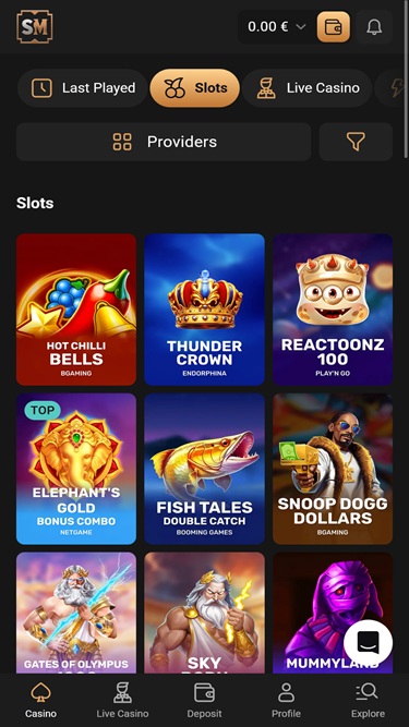 右上には、いつものようにプロフィール設定と、アカウントにすぐに入金できる入金ボタンがあります。ご安心ください。検索バーも用意されているので、お気に入りのカジノゲームをすぐに見つけたり、お気に入りのゲームが見つからない場合はお気に入りのプロバイダーを検索したりできます。
