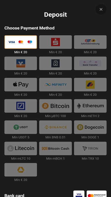 入金と出金に利用できる決済方法に関しては、きっとお好みのものが見つかるはずです。VisaやMasterCardといった信頼性の高い決済方法、SkrillやNetellerといったeWallet 、あるいは暗号通貨に強い関心をお持ちの方でも、きっと嬉しい驚きが待っています。