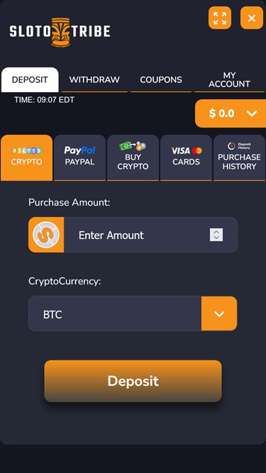 Sloto Tribe での金融取引には、ビットコイン、ビットコイン キャッシュ、ドージコイン、イーサリアム、ライトコイン、ソラナ、トロン、テザー、USDがご利用いただけます。