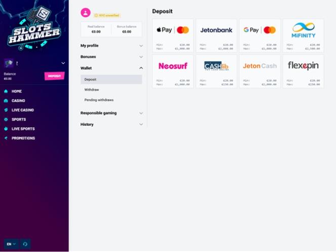 2025年に設立されたSlots Hammerは、リアルマネースロット、インスタントクラッシュゲーム、テーブルゲーム、ライブディーラーなど、何千ものカジノゲームで満たされた大規模なギャンブル環境をプレイヤーに提供することを目指した、総合的なオンラインカジノ兼スポーツベッティングサイトです。同時に、スポーツベッティングセクションと、ボーナスや特典が満載のプロモーションプランも拡大しています。