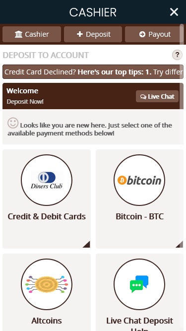 このアメリカ対応オンラインカジノは、プレイヤーに様々な入出金方法を提供しています。プレイヤーは、一般的なeウォレットやペイメントカードといった一般的な決済方法に加え、複数の暗号通貨決済方法も利用できます。