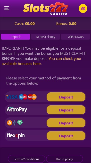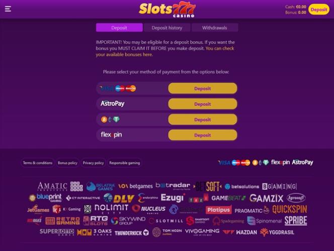 Slots777.Casinoは、キュラソー賭博局の認可と規制を受けています。このブランドは、カナダ、ニュージーランド、ノルウェー、ドイツ、フィンランドからのプレイヤーを歓迎しています。