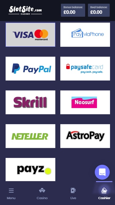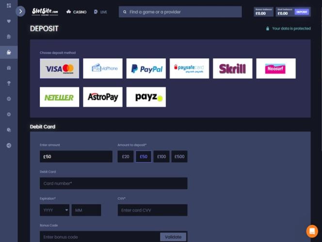プレイヤーが選択できる決済方法に関しては、運営者は豊富な選択肢を揃えています。Slotsite Casinoでは、プレイヤーは一般的なデビットカードやクレジットカード、銀行振込、 Skrill、PayPal、Netellerなどの広く利用されているeウォレット、その他のオンライン決済システムをご利用いただけます。