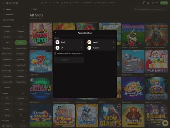 Slotsngo Casinoは、主にインドとバングラデシュのプレイヤーを対象としたギャンブルサイトです。オンラインスロット、テーブルゲーム、クラッシュゲーム、ライブディーラーなど、膨大なカジノゲームカタログを提供することで、多くのプレイヤーの獲得に注力しています。また、スポーツベッティングセクション、様々なプロモーションやボーナスも提供しており、主要な決済方法として暗号通貨も利用可能です。