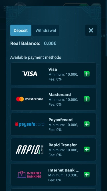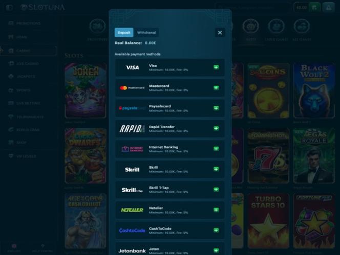 銀行決済に関しては、クレジットカード、eウォレット、さらには暗号通貨など、複数の決済手段が利用可能となっています。従来の銀行決済手段としては、 Visa 、 Mastercard 、銀行電信送金、 Skrill 、 Neteller 、 Jeton 、 MiFinity 、 Paysafecardが挙げられ、暗号通貨決済手段としては、ビットコイン、ビットコインキャッシュ、ドージコイン、ライトコイン、 USDコイン、テザー、リップルが挙げられます。