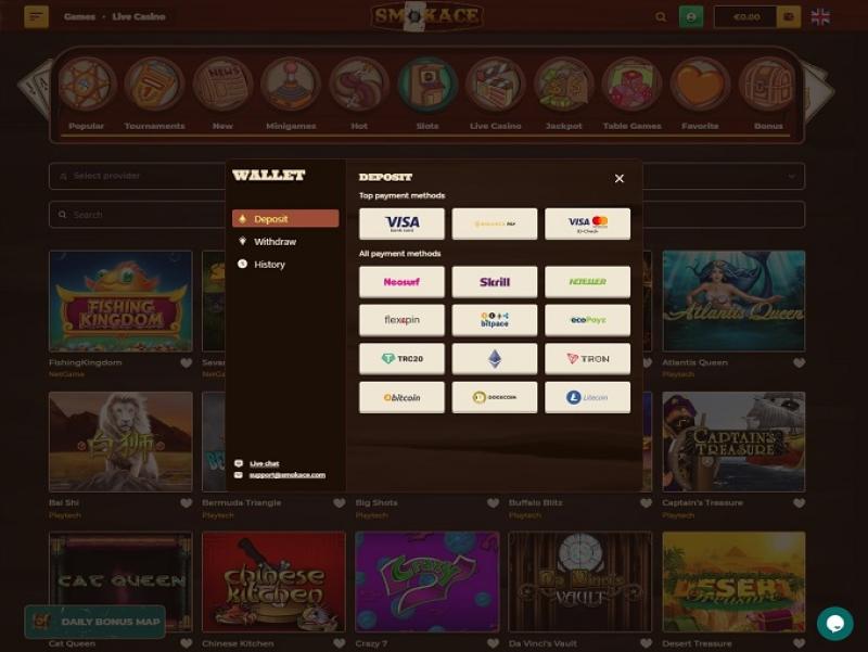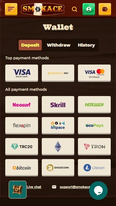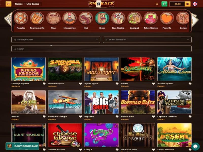 SmokeAce Casino に関しては、優れた開発会社が数多くあり、選択肢に事欠きません。業界トップクラスの開発会社としては、Pragmatic Play、Evolution Gaming、Play 'N Go、Relax Gaming、 Quickspin 、NetEnt、Yggdrasil などが挙げられます。