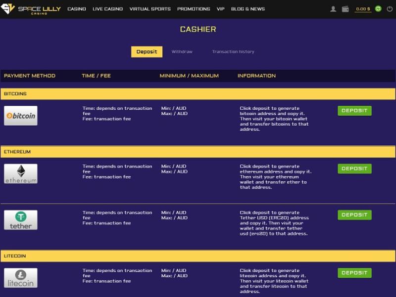 Space Lillyのバンキングシステムは、少々特筆すべき点もあるものの、まずまずの出来です。カジノでは、電信送金、MasterCard、Skrill、Neteller、Paysafecard、Visa、ecoPayz、iDebitによる入金・出金が可能です。出金には48時間の保留時間があり、eWalletの場合は24時間以内に、その他の方法では約2~4営業日で入金されます。