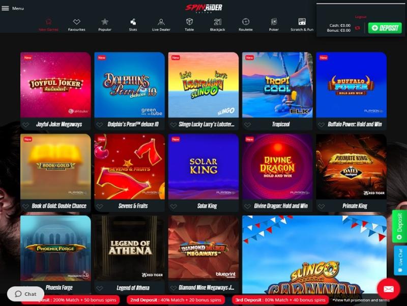 Spin Rider Casinoは Microgaming, Net Entertainment, 1x2gaming, Barcrest, Big Time Gaming, ELK Studios, Evolution Gaming, EYECON, Ezugi, lightningboxgames, Novomatic, Oryx, Play'n GO, Rabcat, Relax Gaming, Thunderkick, Wazdan, Realistic Games, Booming Games, Pragmatic Play, Nolimit City, Felt Gaming, Red Tiger Gaming, IGT, Spinomenal, Red Rake Gaming, Fantasma Games, SYNOT Games, Kalamba, Revolver Gaming, Skywind, Spinmatic, Triple Edge Studios, BGAMING, Northern Lights Gaming, Stormcraft Studios, Switch Studios, Electric Elephant Games, Pocket Games Soft, All41 Studios, Gluck Games, Gameburger Studios, Pulse 8 Studios, Neon Valley Studios, Golden Rock Studios, Spearhead Studios, Swintt, Shuffle Master, SpinPlay Games, GONG Gaming, Blue Guru Games, Lady Luck Games, On Air Entertainment, Buck Stakes Entertainment, Design Works Gaming, Games Global, Ainsworth, Blueprint Gaming, Endemol Games, Greentube, Leander Games, Merkur Gaming, NYX Interactive, Push Gaming, Tom Horn Gaming, WMS, Inspired Gaming, SG Interactive, Gamomat, Red7Mobile, CORE Gaming, Scientific Games, Side City Studios, Reel Time Gaming, Authentic Gaming, Bally Wulff, Iron Dog Studio, Old Skool Studios, Foxium, Just For The Win, Storm Gaming Technology, PearFiction Studios, Apollo Games, Wild Streak Gaming, Slingshot Studios, Fortune Factory Studios, Jade Rabbit Gaming, RubyPlay, 4ThePlayer, AvatarUX, Gamevy, Crazy Tooth Studio, NetGaming, High 5 Games, ReelPlay, AGS Interactive, Alchemy Gaming, Black Pudding Games, Snowborn Games, Hacksaw Gaming, Max Win Gaming, Gold Coin Studios, Half Pixel Studios, SilverBack Gaming, Peter And Sons, Aurum Signature Studios, Armadillo Studios, Lucksome Gaming, Area Vegas, RAW iGaming, Leap Gaming, Wishbone Games, Spribe, Print Studios, Gaming Corps, HammerTime Games, Four Leaf Gaming, INO Games, Nailed It! Games, Live 5, Neko Games, Reel Kingdom, Oros Gaming and Light & Wonderを採用しており、カジノのゲームはウェブベースのインスタントプレイプラットフォームを通じて提供されます。つまり、ゲームはダウンロード可能なソフトウェアセットを必要とせず、インターネットブラウザから直接読み込まれます。モバイルプレイも完全にサポートされているため、スマートフォンやタブレットからプレイできます。