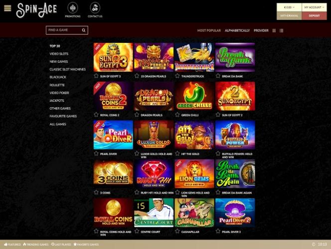 すでに述べたように、Spin-Ace Casinoには実に豊富なオンラインスロットゲームが揃っています。プレイヤーに人気の高いタイトルには、Sun of Egypt 3、Royal Coins 2、Pearl Diver、Break Da Bank Again、15 Dragon Pearlsなどがあります。