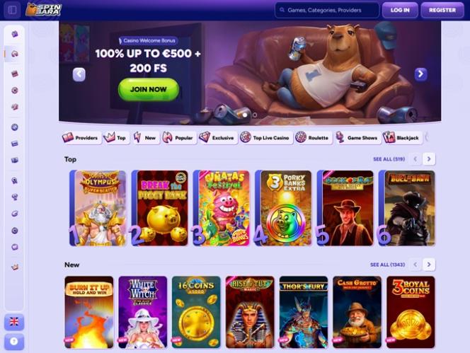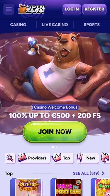 サイトに入るとすぐに、ソファでくつろぎながら冷たい炭酸飲料を楽しむ、アニメーション化されたカピバラが迎えてくれます。これがサイト全体の雰囲気を決定づけ、自宅にいながらカジノのあらゆる可能性を体験できるというコンセプトを強調しています。これはちょっとした工夫と言えるでしょう。