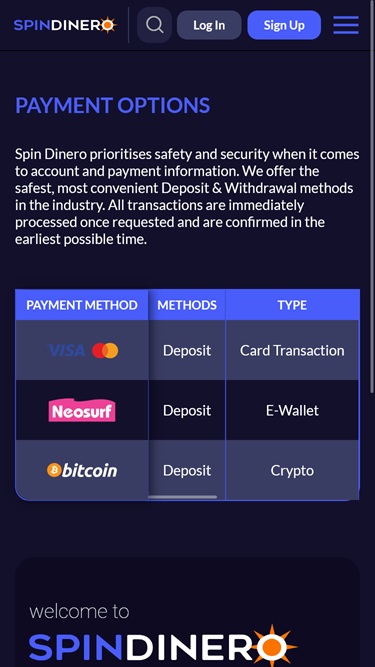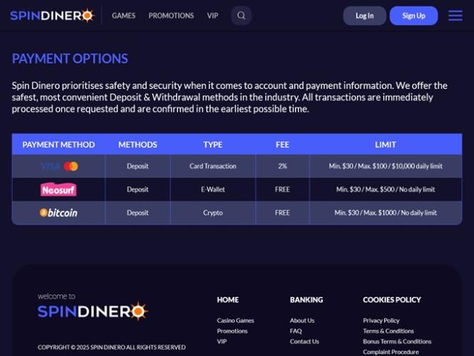 Spindineroカジノでは、 Visa 、 Mastercard 、 Neosurfなど、複数の決済方法で資金を管理できます。さらに、ビットコインでの入出金も可能です。