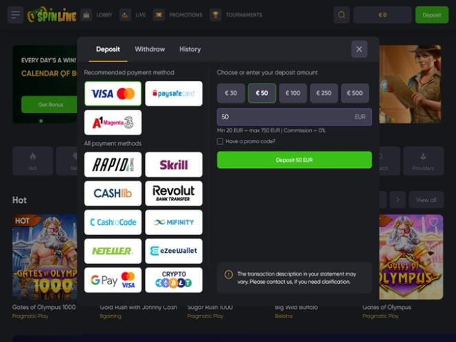 従来の銀行決済方法で入金・出金したいとします。Spinline Casinoでは、 Visa 、 Mastercard 、 Paysafecard 、 Skrill 、 Neteller 、 eZeeWalletなど、様々な決済方法をご利用いただけます。さらに、ビットコイン、ビットコインキャッシュ、カルダノ、イーサリアム、ライトコイン、テザーといった最新の暗号通貨決済方法もご利用いただけます。