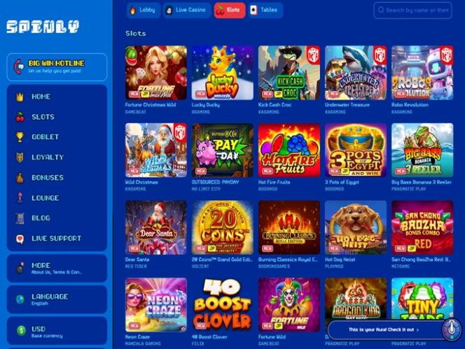 カジノにはSpinlyの報酬ハブであるゴブレットがあり、プレイヤーはサトシと追加スピンを獲得できます。プレイしているかどうかに関係なく、20分ごとにサトシ、45分ごとにボーナススピンなどの報酬が自動的に補充されます。