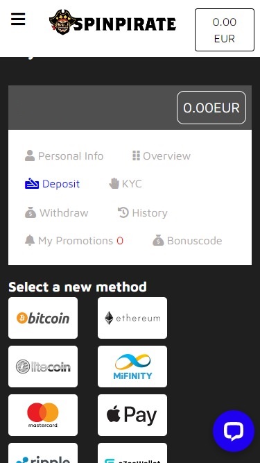 Spinpirateオンラインカジノでは、スカンジナビアのプレイヤーに人気のeウォレットをはじめ、人気で信頼性の高い様々な決済方法をご利用いただけます。暗号通貨での決済もサポートされています。利用可能なすべての決済方法において、出金時間は適切で、最低入金額も低く設定されています。ただし、カジノのウェブサイトには最大出金限度額が記載されていないことにご注意ください。