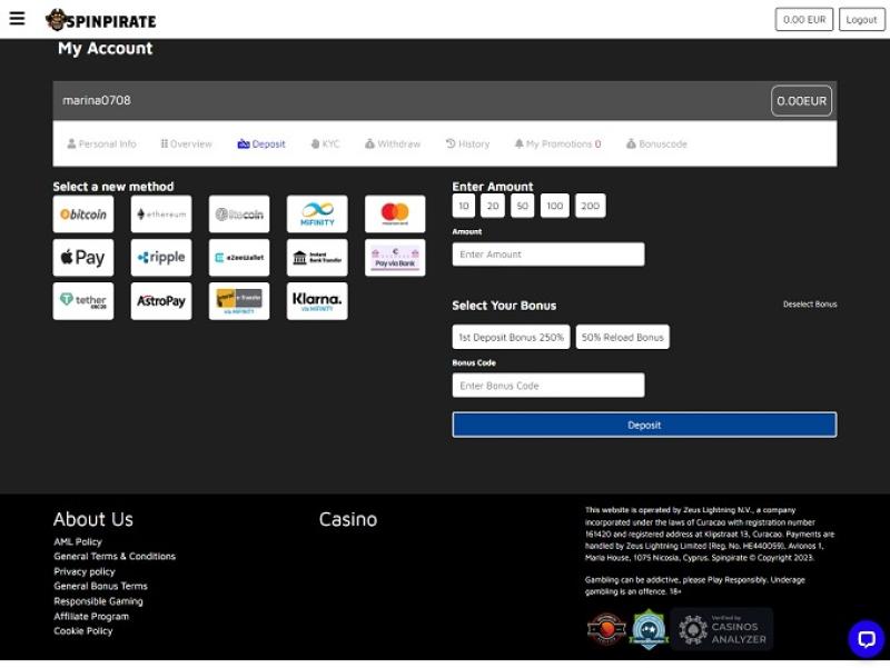 - Spinpirate は、出金リクエストがキャッシュアウトのしきい値に達した場合にアカウント検証を実行する権利を留保します。