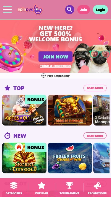 愛らしいパグがブランドのマスコットであり、完全に機能し、デザイン性に優れたカジノのホームページの上部から訪問者に笑顔で挨拶しています。