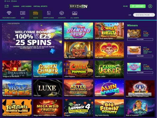 Spinson Casinoでは数百種類のスロットをプレイでき、そのほとんどはMicrogaming社とNet Entertainment社製のスロットです。また、プログレッシブジャックポットも提供しており、いつでも数百万ドルの賞金を獲得できます。