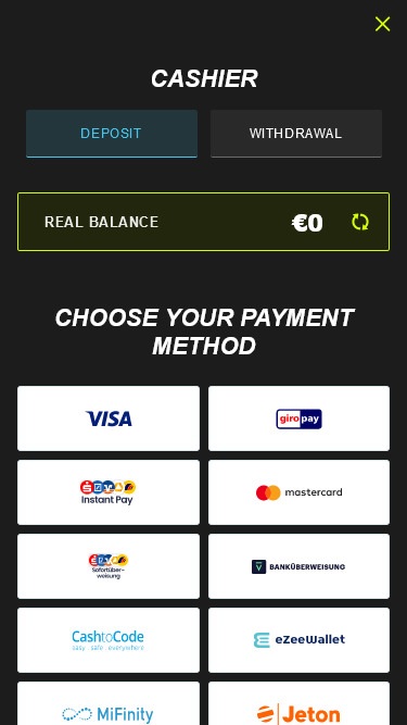この現代的なオペレーターは、決済カード、人気のeウォレット、銀行振込など、様々な決済方法を提供しています。また、暗号通貨決済に切り替えた場合にも、このオペレーターが対応しています。利用可能な決済方法は国によって異なり、出金時間も十分であることにご留意ください。