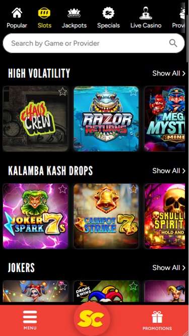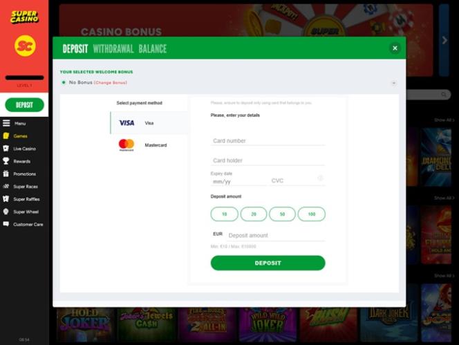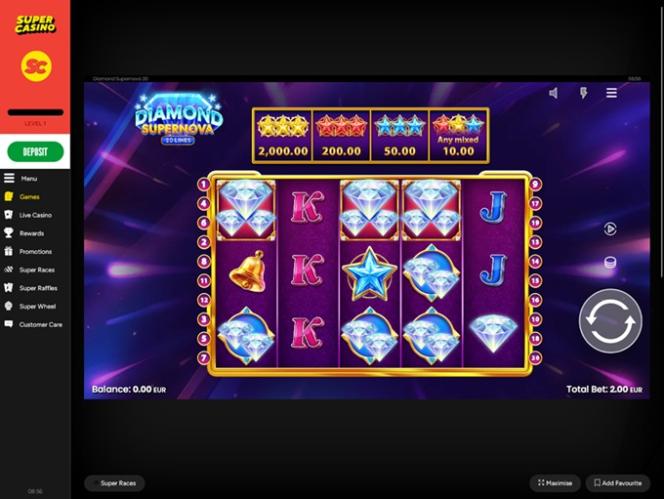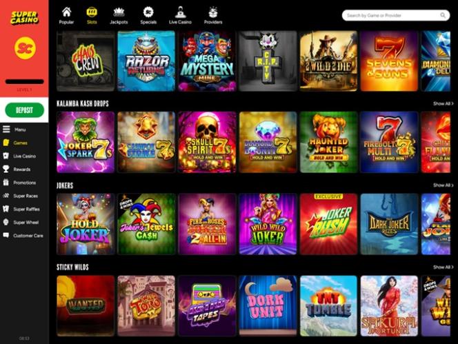 SuperCasinoは Amaya, Microgaming, Net Entertainment, 1x2gaming, Barcrest, Big Time Gaming, ELK Studios, Evolution Gaming, iSoftBet, lightningboxgames, Novomatic, Oryx, Play'n GO, Quickspin, Relax Gaming, Thunderkick, Yggdrasil, Endorphina, Wazdan, Booming Games, Stakelogic, Pragmatic Play, Nolimit City, Felt Gaming, Red Tiger Gaming, Spinomenal, Skillzzgaming, Fantasma Games, FunFair, Kalamba, Triple Edge Studios, Northern Lights Gaming, Evoplay, Stormcraft Studios, Switch Studios, Electric Elephant Games, Pocket Games Soft, Bulletproof Games, All41 Studios, Gluck Games, Gameburger Studios, Neon Valley Studios, Golden Rock Studios, Spearhead Studios, Swintt, SpinPlay Games, HungryBear Gaming, SmartSoft Gaming, Real Dealer Studios, Blue Guru Games, On Air Entertainment, Elysium Studios, Games Global, 2by2 Gaming, Bally Technologies, bluberi, Blueprint Gaming, Greentube, NextGen, Push Gaming, Tom Horn Gaming, WMS, Inspired Gaming, Gaming Realms, SG Interactive, Gamomat, Red7Mobile, Scientific Games, Side City Studios, Reel Time Gaming, Iron Dog Studio, Old Skool Studios, Foxium, Just For The Win, Reflex Gaming, PearFiction Studios, Slingshot Studios, Golden Hero, Fortune Factory Studios, STHLM Gaming, 4ThePlayer, AvatarUX, Gamevy, Crazy Tooth Studio, NetGaming, ReelPlay, Japan Technicals Games, Alchemy Gaming, Black Pudding Games, Snowborn Games, Boomerang Studios, Hacksaw Gaming, Max Win Gaming, Gold Coin Studios, Bang Bang Games, Half Pixel Studios, Slotmill, SilverBack Gaming, Peter And Sons, Aurum Signature Studios, Lucksome Gaming, Leap Gaming, Apparat Gaming, Circular Arrow, INO Games, Atomic Slot Lab, Neko Games, Reel Kingdom, Oros Gaming, Indigo Magic, Light & Wonder and Sneaky Slotsを採用しており、ゲームはウェブベースのインスタントプレイプラットフォームを通じて提供されます。多くのPlaytechカジノで見られるダウンロード型のソフトウェアは不要のようです。モバイルプレイにも対応しており、プレイヤーはスマートフォンやタブレットからゲームをプレイできます。