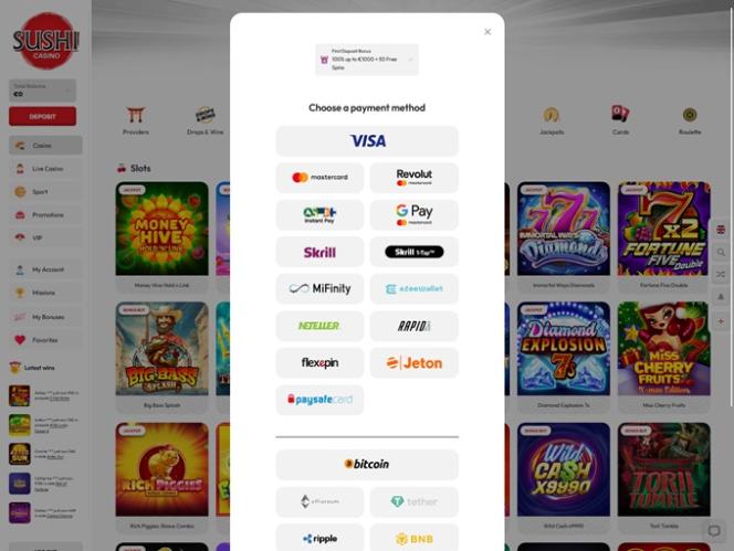 暗号通貨での入金をご希望の場合でも、従来の決済方法をご利用いただく場合でも、Sushi Casinoでは、広く普及している様々な決済方法で金融取引を行うことができます。ただし、一部の決済方法は、お客様のギャンブル管轄区域によってはご利用いただけない場合がありますのでご了承ください。