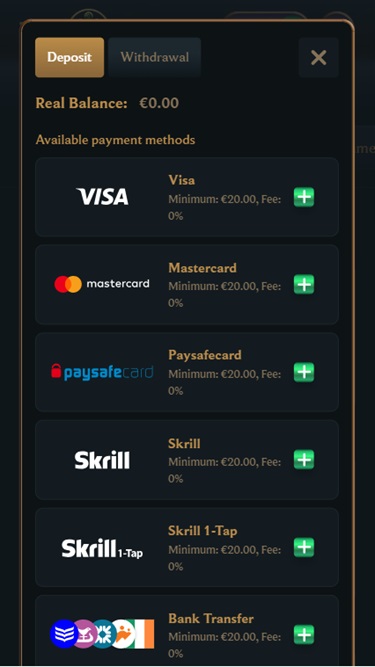 カジノのキャッシャーは、従来型決済と暗号通貨決済の幅広い決済方法に対応しています。利用可能な決済方法は国によって異なりますが、ギャンブルの管轄区域に関わらず、入金と出金に利用できる人気の決済方法が多数あります。バンキングページにはドロップダウンメニューがあり、国と通貨を選択すると、お住まいの地域で利用可能なすべての決済方法が表示され、それぞれに明確な制限が明記されています。