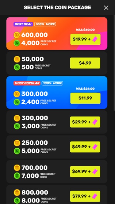 シークレットコインは、ストアから直接購入することはできませんが、TAOコインを購入するとギフトとして同梱される、もう一つのプレミアム仮想通貨です。同様に、ゲームプレイ、デイリープライズ、ウィークリープロモーション、トーナメント、スクラッチカード、貯金箱、またはメールの送信を通じて獲得できます。シークレットコインとTAOコインの主な違いは、実際の賞品と交換できる点です。
