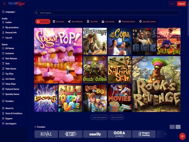 ThisIsVegas カジノは BetSoft, Genesis Gaming, Rival, Saucify, Arrows Edge, Radi8 Games, Fresh Deck Studios, Woohoo Games, Qora Games, Genii and Dragon Gamingを採用しており、プレイヤーはダウンロード可能なソフトウェアを通じてカジノのゲームをプレイできるほか、Web ブラウザを通じてゲームをプレイできるインスタント プレイ モデルも利用できます。Slot machines