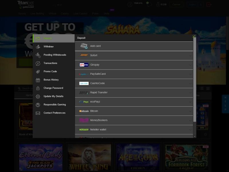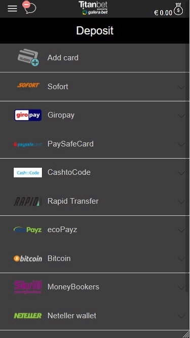 TitanBetのバンキングシステムは優れており、48時間の保留期間後、勝利金は迅速に支払われます。当サイトでは、PayPal、ecoPayz、Neteller、Skrillでの入出金が可能です。また、SOFORT、WebMoney、PugglePay、Diners、Maestro、MasterCard、EntroPay、Visa、GiroPay、Moneta.ru、Neosurf、iDebit、ClickandBuy、Euteller、Paysafecard、Poli、銀行振込でも入金可能です。