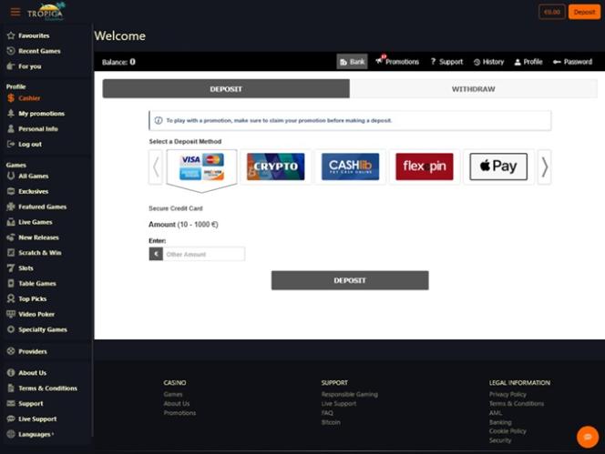 Tropica Casinoは BetSoft, Genesis Gaming, Rival, Saucify, Vivo Gaming, Arrows Edge, Radi8 Games, Fresh Deck Studios, Woohoo Games, Qora Games, Genii and Dragon Gamingを採用しており、多くのアメリカ人プレイヤーがプレイする機会がなかったであろうゲームを網羅した豊富なゲームライブラリを提供しています。カジノはダウンロード可能なソフトウェアと、ウェブブラウザから直接プレイできるインスタントプレイモデルの両方でご利用いただけます。その他のゲーム