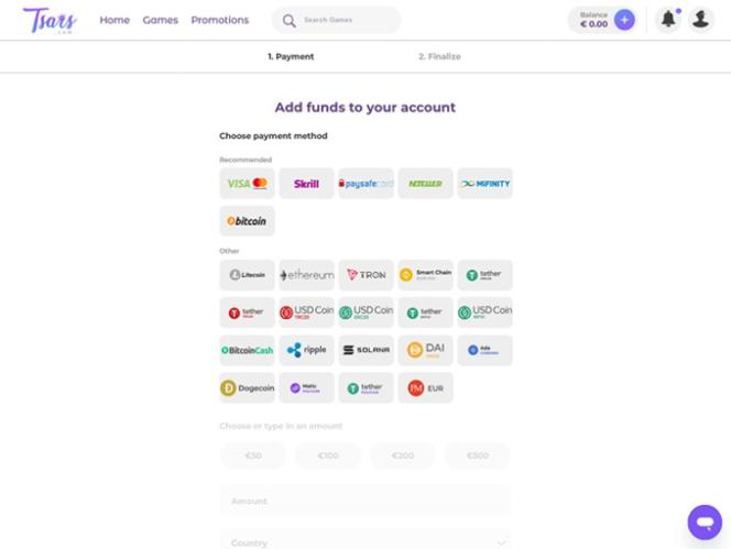 以下に、Tsars Casino のさまざまな入金および出金オプションを示します。