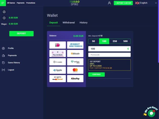 TurboSpinsは人気の仮想通貨に対応しており、信頼性の高い決済方法による迅速な決済取引を提供しています。さらに、ギャンブラーは24時間体制でサービスを提供するプロフェッショナルなカスタマーケアを利用できます。