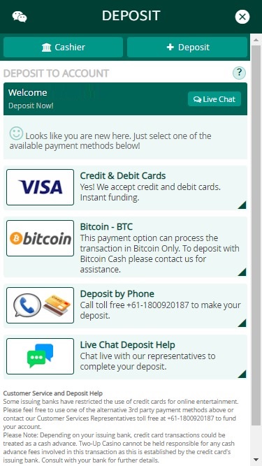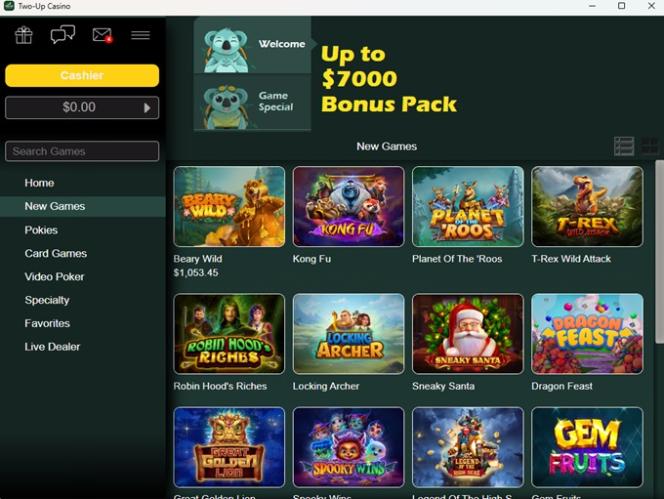Two-Up Casinoは Real Time Gaming, Visionary iGaming and Spinlogic Gamingを採用しており、カジノのゲームはウェブベースのインスタントプレイプラットフォームを通じて提供されるため、パソコンのハードドライブに重いソフトウェアをダウンロードする必要はありません。また、モバイルプレイにも完全対応しているため、スマートフォンやタブレットからお気に入りのスロットにアクセスできます。