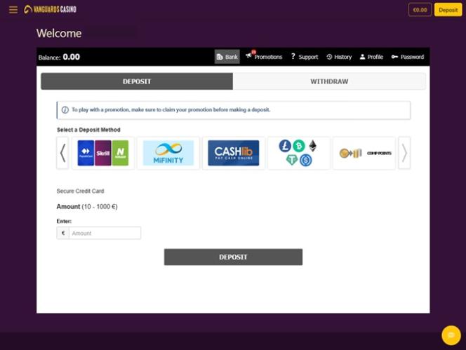 利用規約をよく確認したところ、Vanguard Casinoにはプレイヤーに対して搾取的または不公平な点が見当たりません。Vanguard Casinoのバンキングシステムは適切で、入出金はVisa、ecoPayz、Skrill、Netellerで処理されます。また、uPayCard、MasterCard、UseMyBank、American Express、Paysafecardでも入金可能です。出金は2~5営業日以内に処理され、週あたりの出金限度額は4,000ドルです。