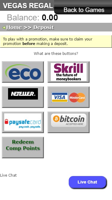 Vegas Regal Casinoは Rivalを採用しており、カジノゲームはダウンロード可能なソフトウェアと、ウェブブラウザから登録、入金、プレイできるウェブベースのインスタントプレイプラットフォームの両方で提供されています。モバイルサポートも提供されており、スマートフォンやタブレットからプレイできます。その他のゲーム