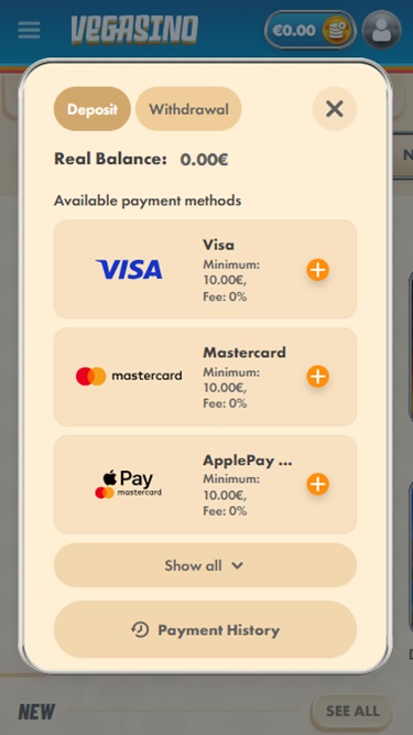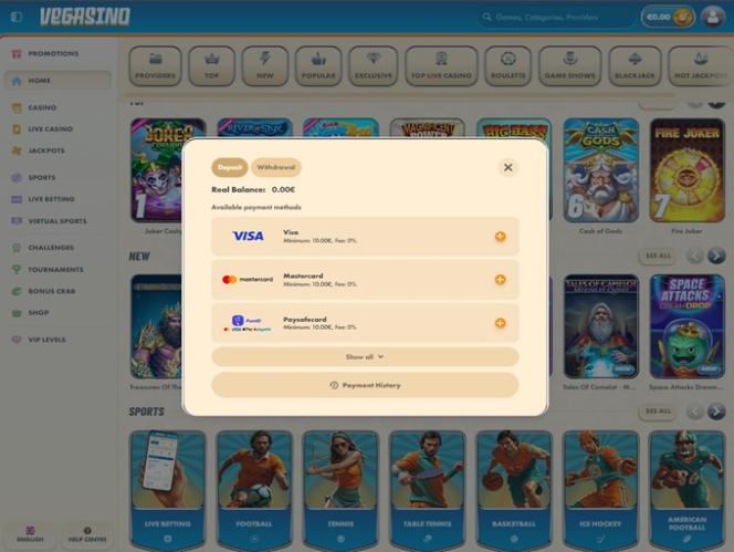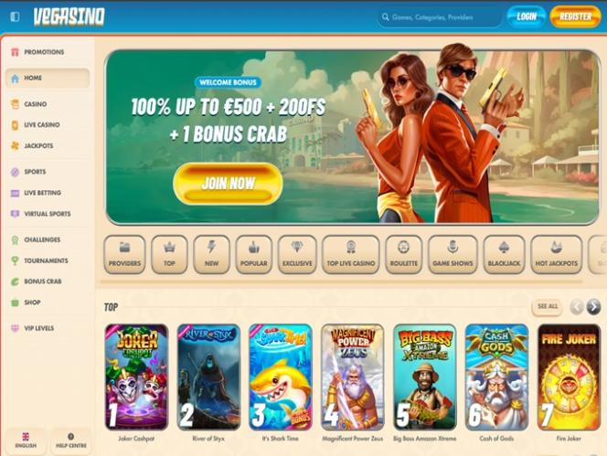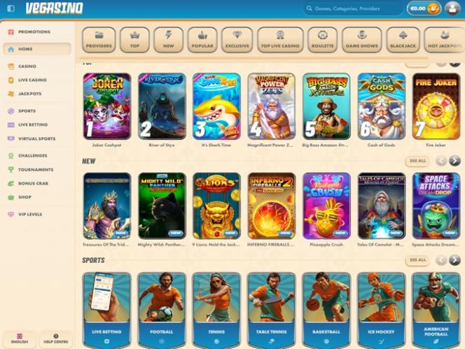 Vegasino Casinoでは、ウェブサイトの左側に展開可能な縦型メニューが用意されており、プレイヤーはそこからすべてのプロモーション資料、主要なゲームカテゴリー、ショップ、VIPプログラム、トーナメントに簡単にアクセスできます。また、ウェブサイトの言語も選択でき、ドイツ語、イタリア語、フランス語、ギリシャ語、スペイン語、フィンランド語、ノルウェー語、ポルトガル語、ポーランド語、チェコ語、トルコ語から選択できます。