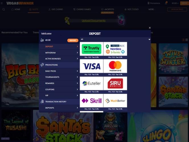 VegasWinnerカジノの利用規約をよく確認したところ、プレイヤーに対して不公平または搾取的な点は見当たりません。VegasWinnerのバンキングシステムは多様で、入出金は電信送金、Neteller、Visa、MasterCard、PayPal、Skrill、ecoPayz、Paysafecard、WebMoney、ClickandBuy、Maestroで可能です。入金はMoneta.ru、iDeal、PugglePay、EntroPay、Neosurf、Postepay、Solo、Giropay、SOFORT Banking、EPay、Wirecard、Instand Bank、Yandex、Poliでも受け付けています。出金はSpeedcardでも可能です。カジノの月間出金限度額は10,000ユーロで、eWalletの場合は当日中に出金処理されますが、その他の方法では2~7営業日かかる場合があります。
