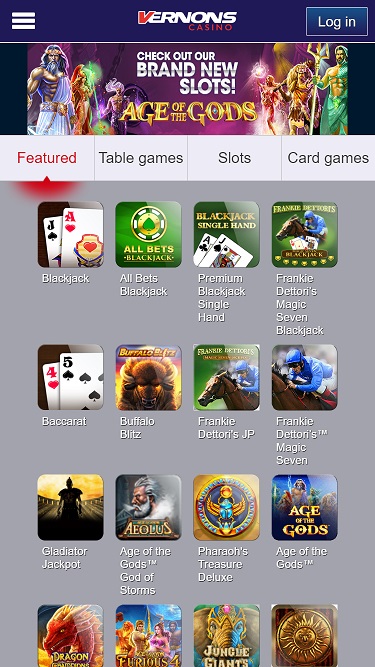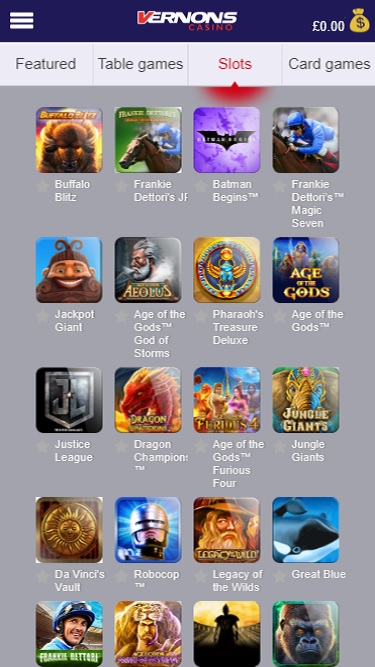 スロットは、Vernons Casino でプレイできるゲームの大部分を占めており、ユニークなビデオスロット、クラシックスロット、Beach Life、Sweet Party、Spamalot Holy Grail などのプログレッシブゲームが豊富に用意されており、いずれも数百万ドルの賞金が用意されています。
