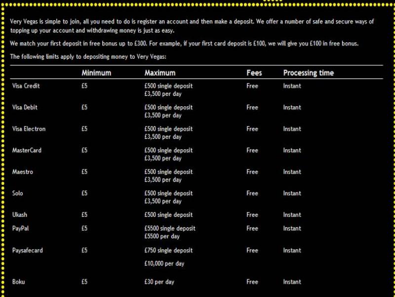 Very Vegasモバイルカジノのバンキングシステムはやや制限がありますが、モバイルベッティングサイトとしては十分な機能です。入金と出金はVisa、MasterCard、Paysafecard、Solo、PayPal、Maestroで受け付けており、出金は銀行振込でも行えます。PayPalからの出金は1日あたり1,000ポンドまで、クレジットカードとデビットカードからの出金は1日あたり5回まで、それぞれ20,000ポンドまで可能です。出金処理には3~5日かかります。での銀行オプション Very Vegas Mobile Casino
