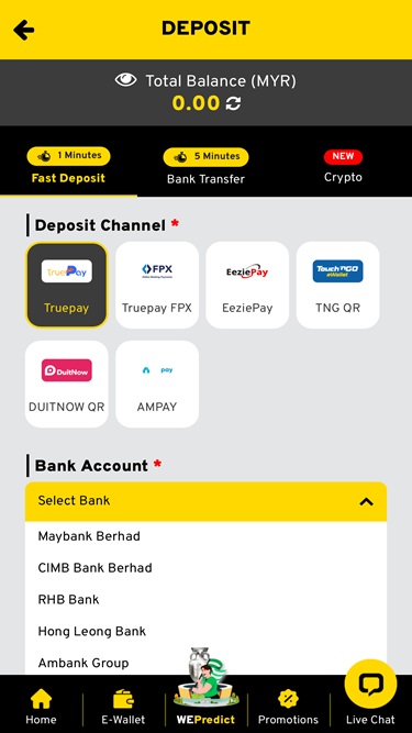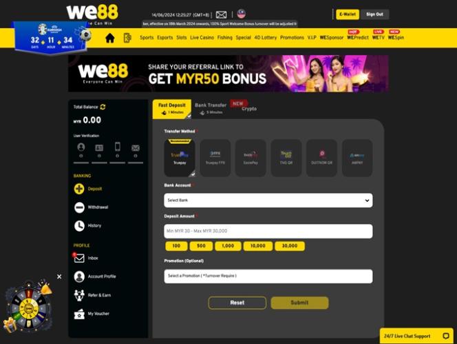 プレイヤーは、銀行振込、EeziePay、TruePay、DuitNow、Touch'n Goといった一般的な従来の決済方法で入出金できます。また、このウェブサイトでは、ビットコイン、イーサリアム、テザーといった暗号通貨での取引も可能です。