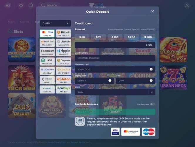 Wild Tornadoのバンキングシステムは非常に優れており、銀行振込、Maestro、MasterCard、Skrill、Neteller、Paysafecard、Visa、Yandex、Sofort、Trustly、Bitcoin、Zimplerによる入出金が可能です。賞金は24時間の保留期間があり、eWalletの場合はその後即座に支払われます。その他の支払い方法では、さらに数日かかる場合があります。15,000ドルを超える賞金は毎月分割払いとなるという、不適切なポリシーがあります。