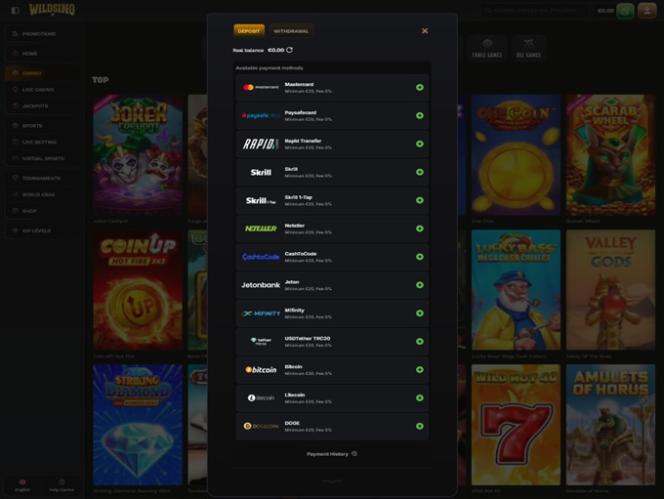 決済方法に関しては、このブランドはプレイヤーに従来の入金・出金方法と最新の入金・出金方法を提供しています。Visa、 Mastercard 、 Skrill 、 Neteller 、 Jeton 、 MiFfinity 、銀行振込といった従来の決済方法に加え、ビットコイン、ライトコイン、ドージコイン、テザーといった最新の仮想通貨も決済手段として利用可能です。