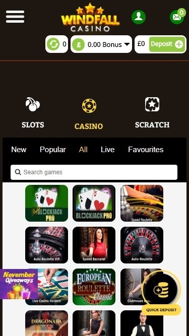 Windfall Casinoは Cozy Gamesを採用しており、カジノゲームはウェブベースのインスタントプレイプラットフォームを通じて提供されます。プレイヤーはウェブブラウザからゲームをプレイできます。モバイルデバイスにも対応しているため、スマートフォンやタブレットからでもプレイ可能です。