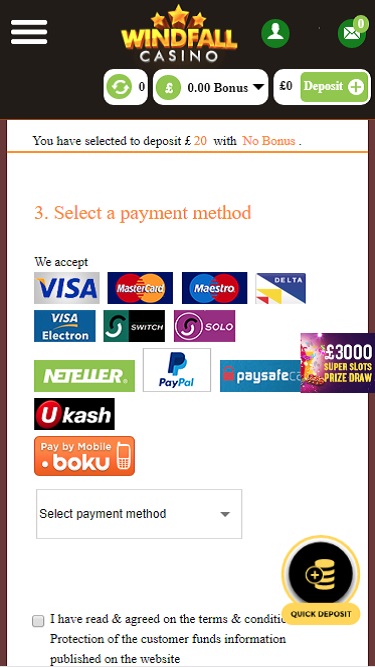 Windfall Casinoの銀行システムは少々残念です。賞金の出金限度額は週1,500ポンド、月3,000ポンドと低くなっています。さらに困ったことに、入金処理には7~10営業日かかります。カジノはMaestro、MasterCard、Neteller、Paysafecard、Visa、Boku、Soloによる入金と出金に対応しています。