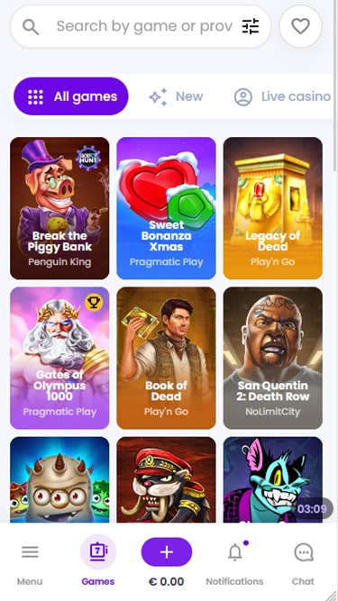 カジノは、白い背景に華やかで輝く未来的なディテールを備えたネオンパープルとターコイズの色合いでデザインされた、カラフルで美しいゲームインターフェースを使用しているため、カジノプラットフォームは非常にモダンで魅力的に見えます。