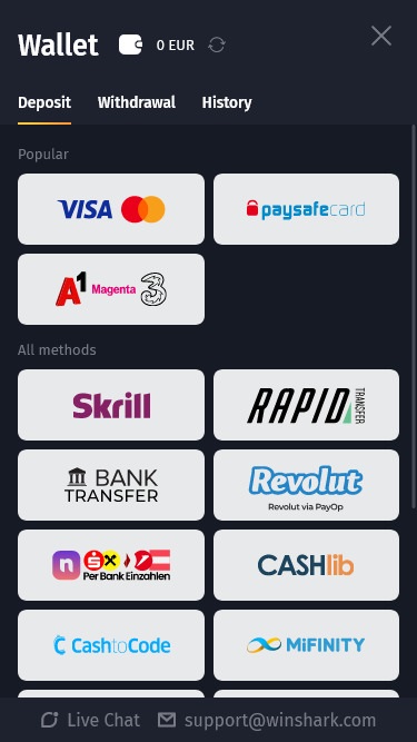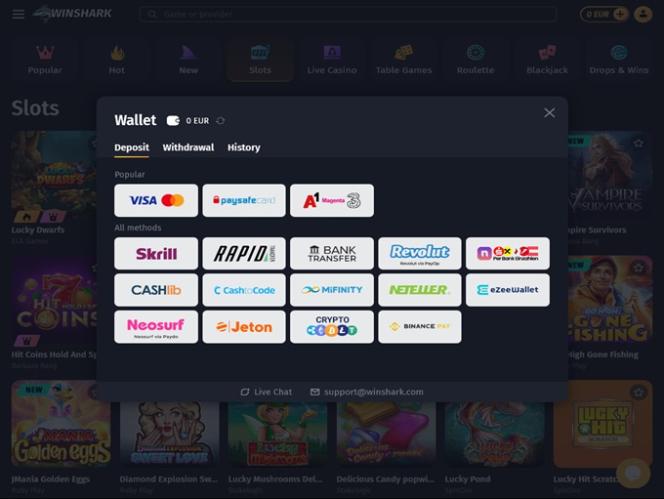 WinSharkカジノでは、複数の決済方法に対応しており、入金と出金が可能です。従来の銀行決済にはVisa 、 Mastercard 、銀行振込、 Jeton 、 MiFinity 、 Paysafecard 、 Neosurf 、 Netellerなどがあり、最新の決済方法としてはビットコイン、ビットコインキャッシュ、イーサリアム、ライトコイン、テザー、カルダノなどの暗号通貨が利用可能です。
