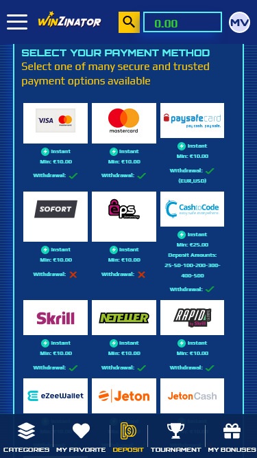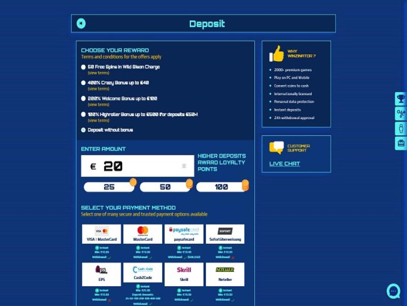 - Winzinator Casino は出金手数料および非アクティブ手数料を請求する権利を留保します。