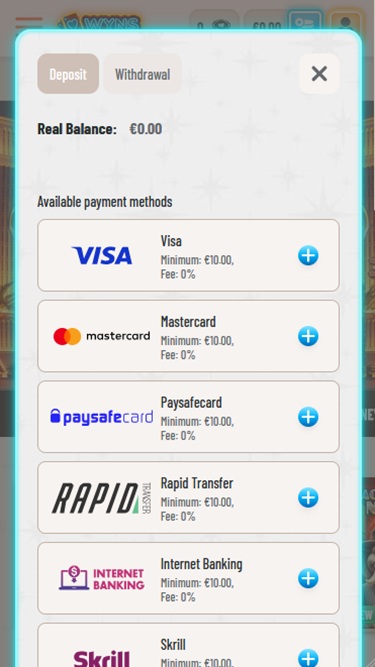 Wyns カジノでは、MiFinity、銀行電信送金、Neosurf、Nordea、Skrill、Netteler、Visa、MasterCard などさまざまな支払い方法のほか、ビットコイン、ビットコイン キャッシュ、カルダノ、ドージコイン、イーサリアム、ライトコイン、リップル、テザー、USD コインなどの多くの暗号通貨オプションも提供しています。